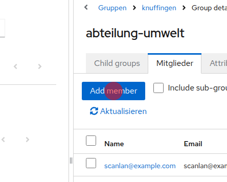 Um einen Benutzer zu einer Benutzergruppe hinzuzufügen muss auf den Reiter "Mitglieder" geklickt werden und dann über "Add member" die entsprechenden Benutzer ausgewählt werden. Mit einem Klick auf "Hinzufügen" wird der Vorgang abgeschlossen.