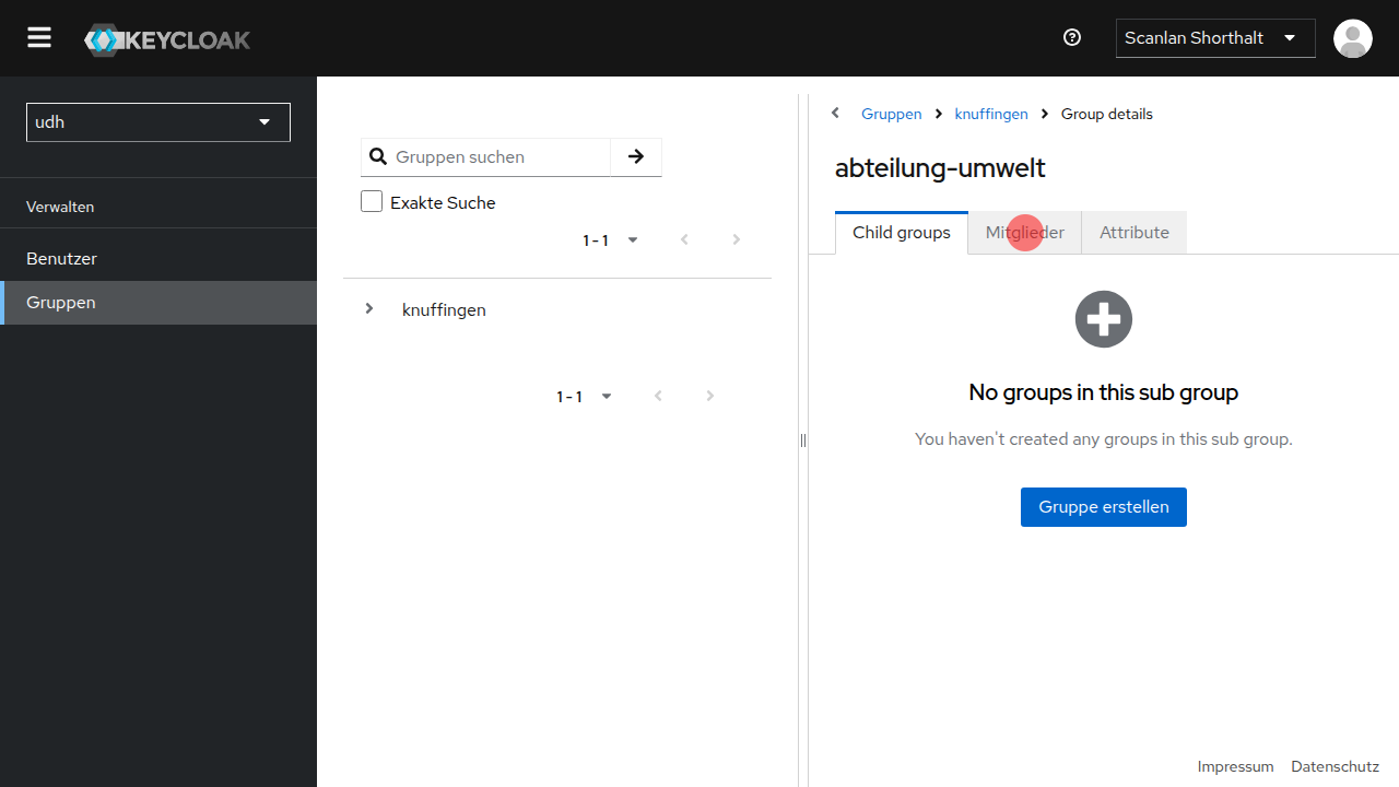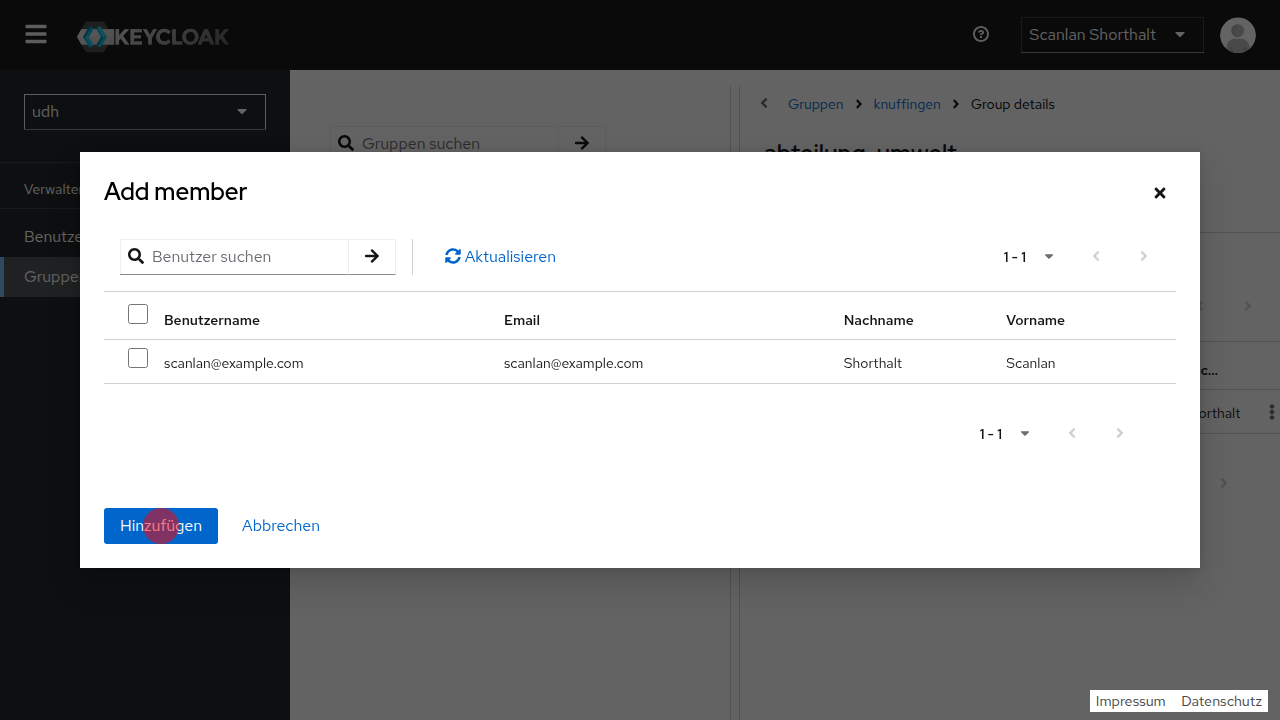 Die Zuordnung von Benutzern zu Benutzergruppen wird in Keycloak vorgenommen.