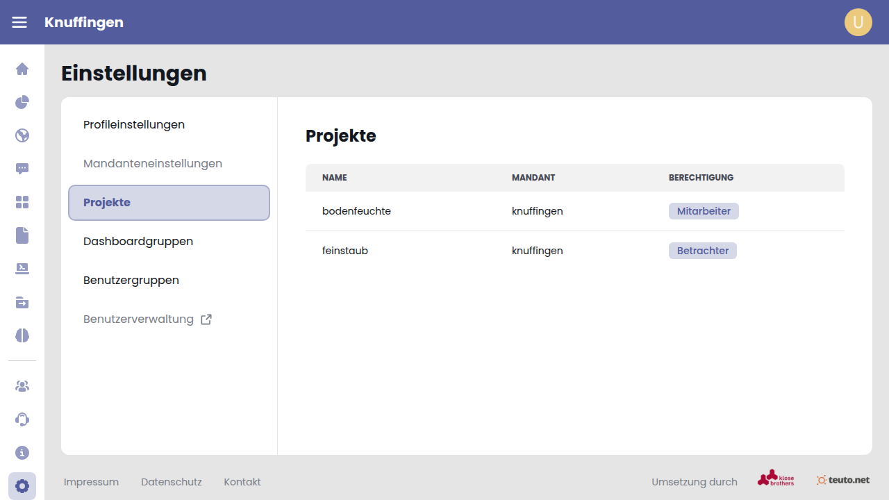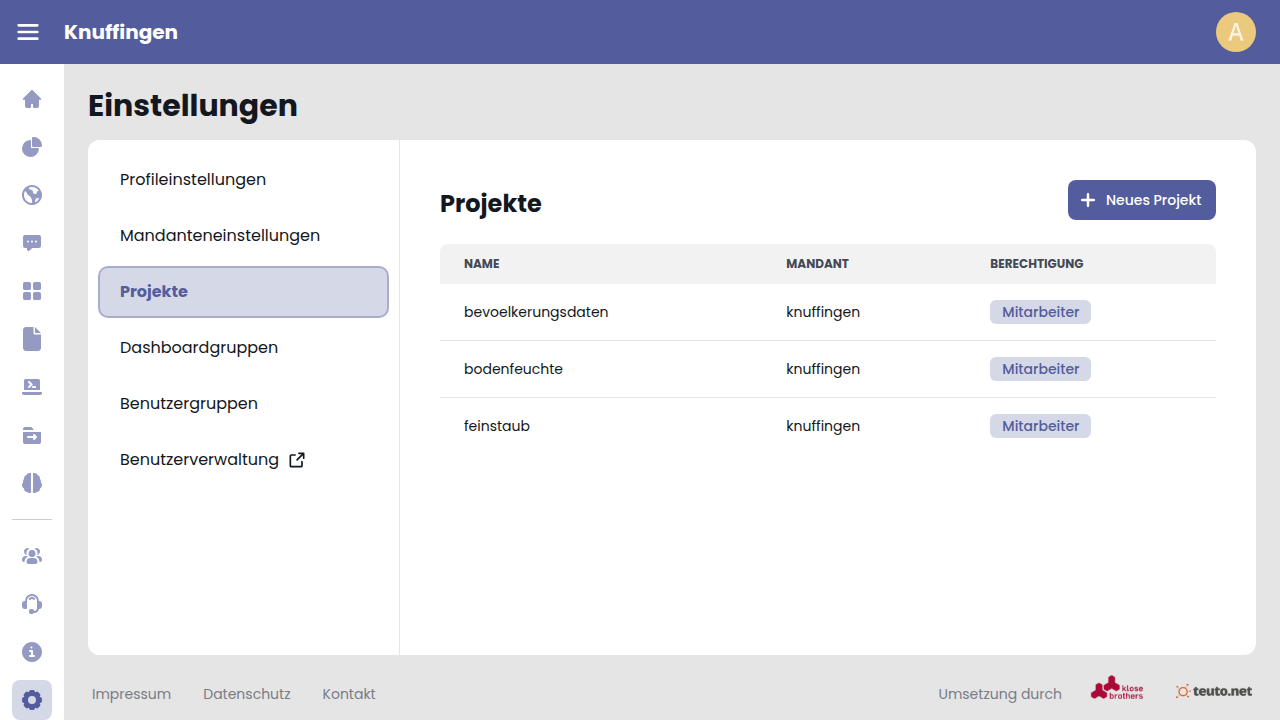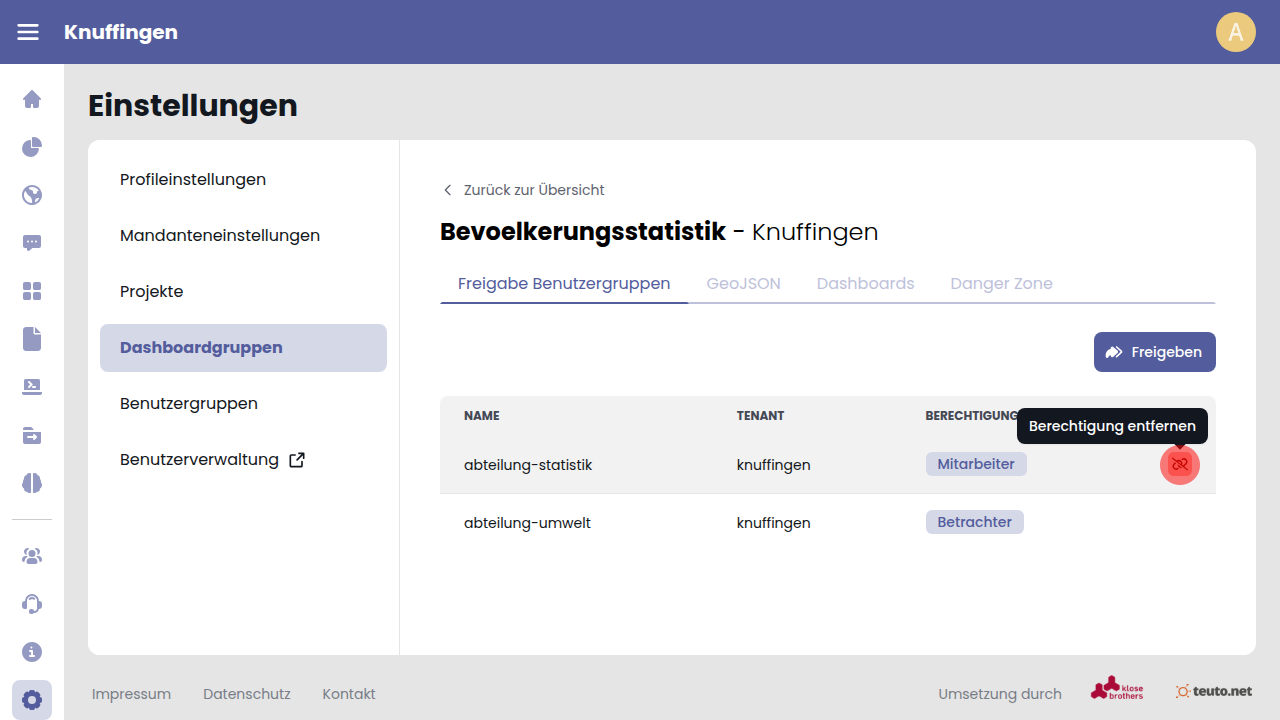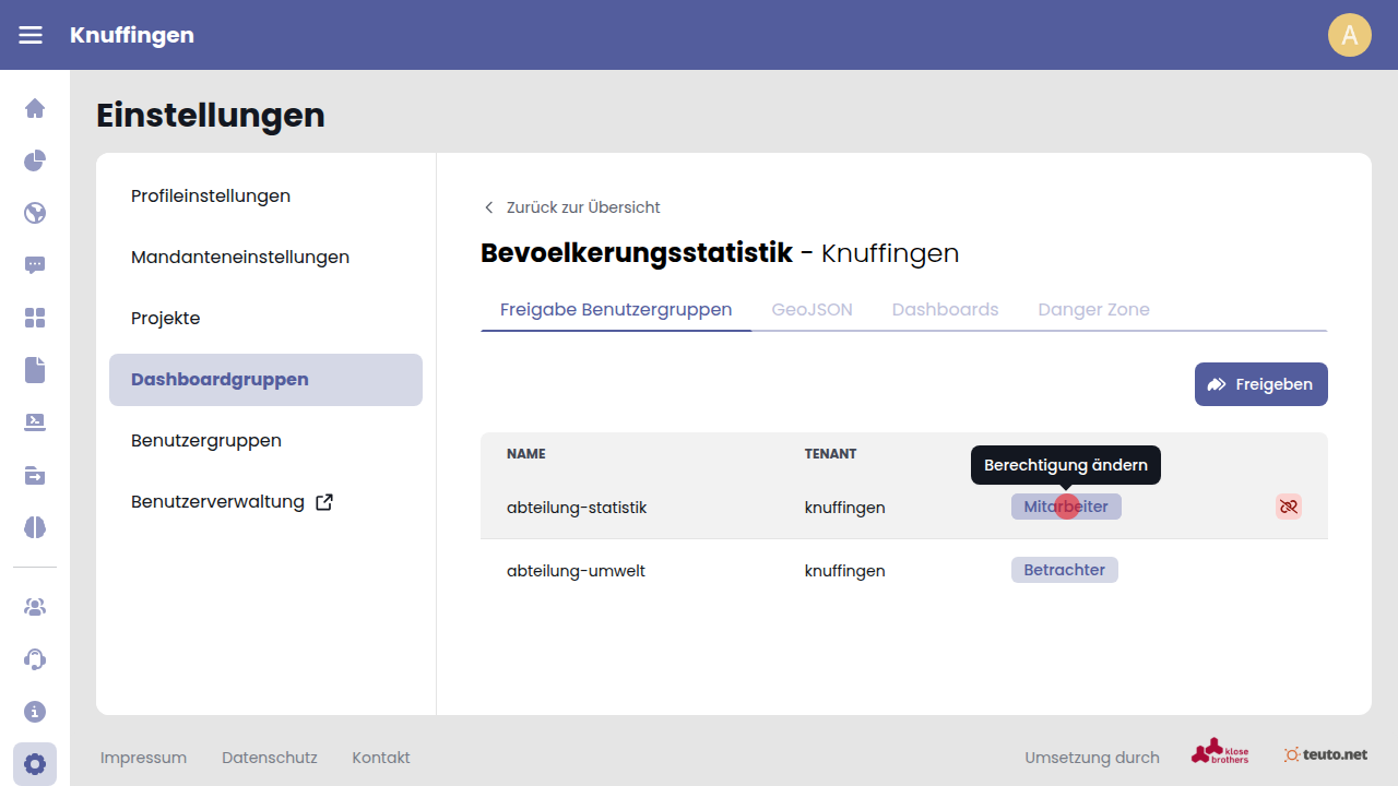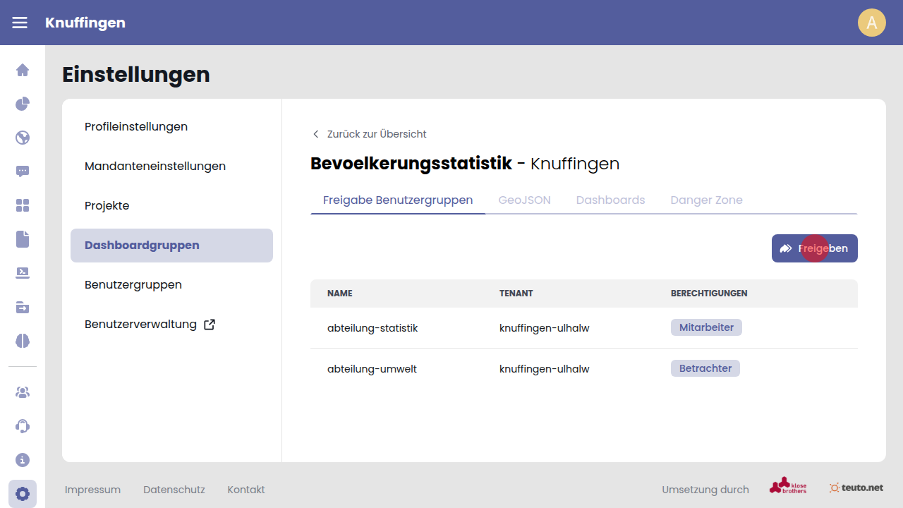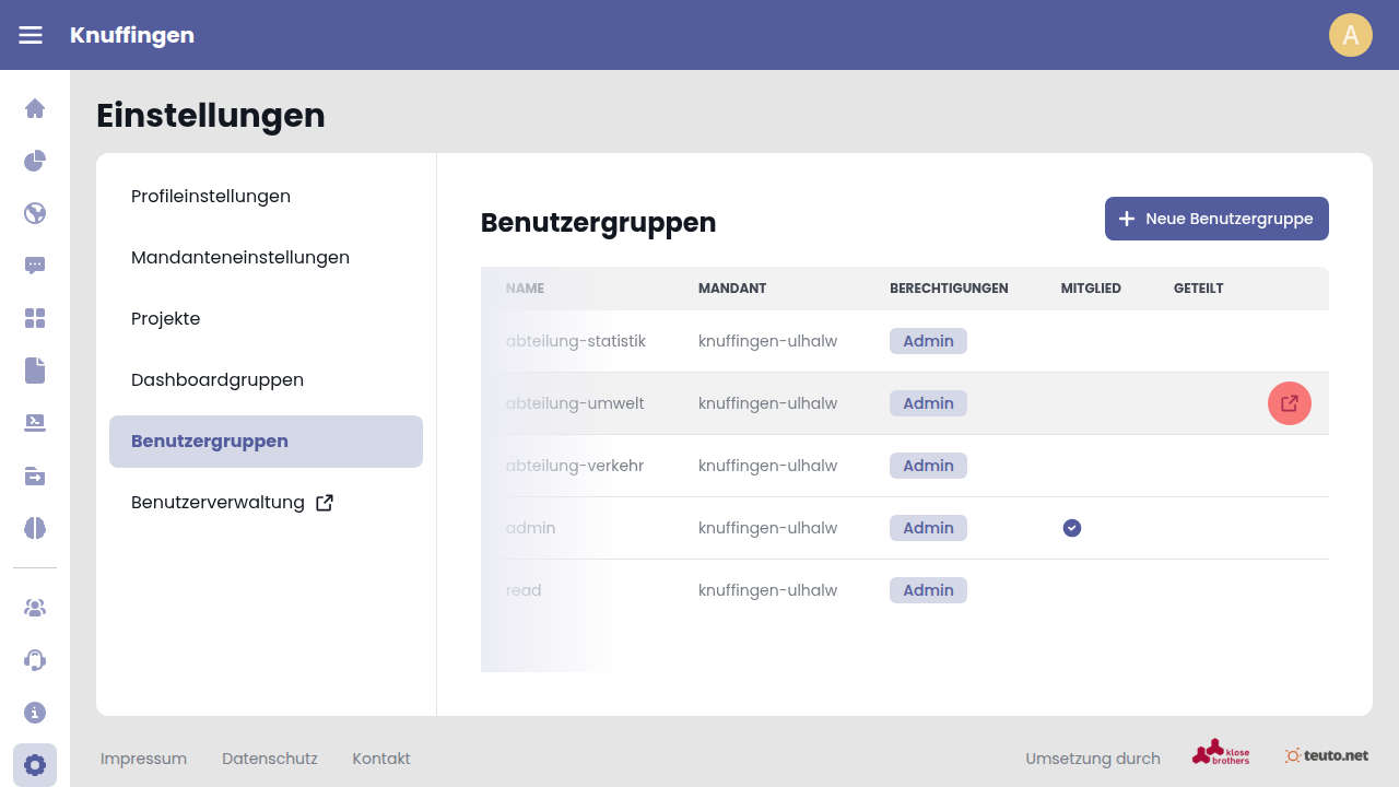 Nutzende können nur über Benutzergruppen Rechte an Dashboardgruppen und Projekten zugeordnet werden. Unter diesem Menüpunkt können mit den entsprechenden Berechtigungen Benutzergruppen erstellt, gelöscht und Berechtigungen vergeben werden. Außerdem können Benutzergruppen mit allen anderen Mandanten "geteilt" werden, sodass andere Mandanten dieser Gruppe Berechtigungen an ihren Projekten geben kann.