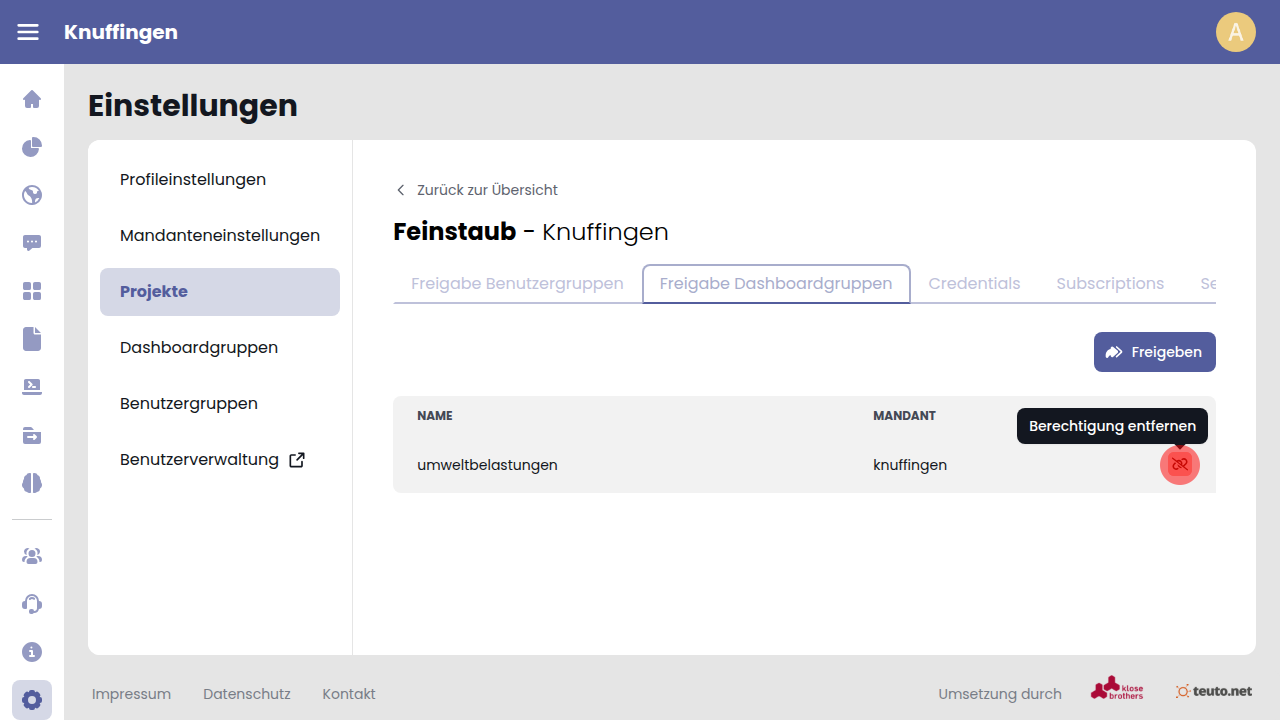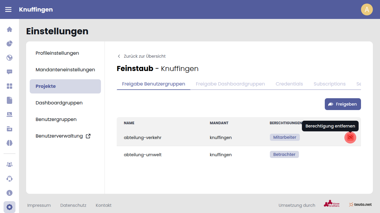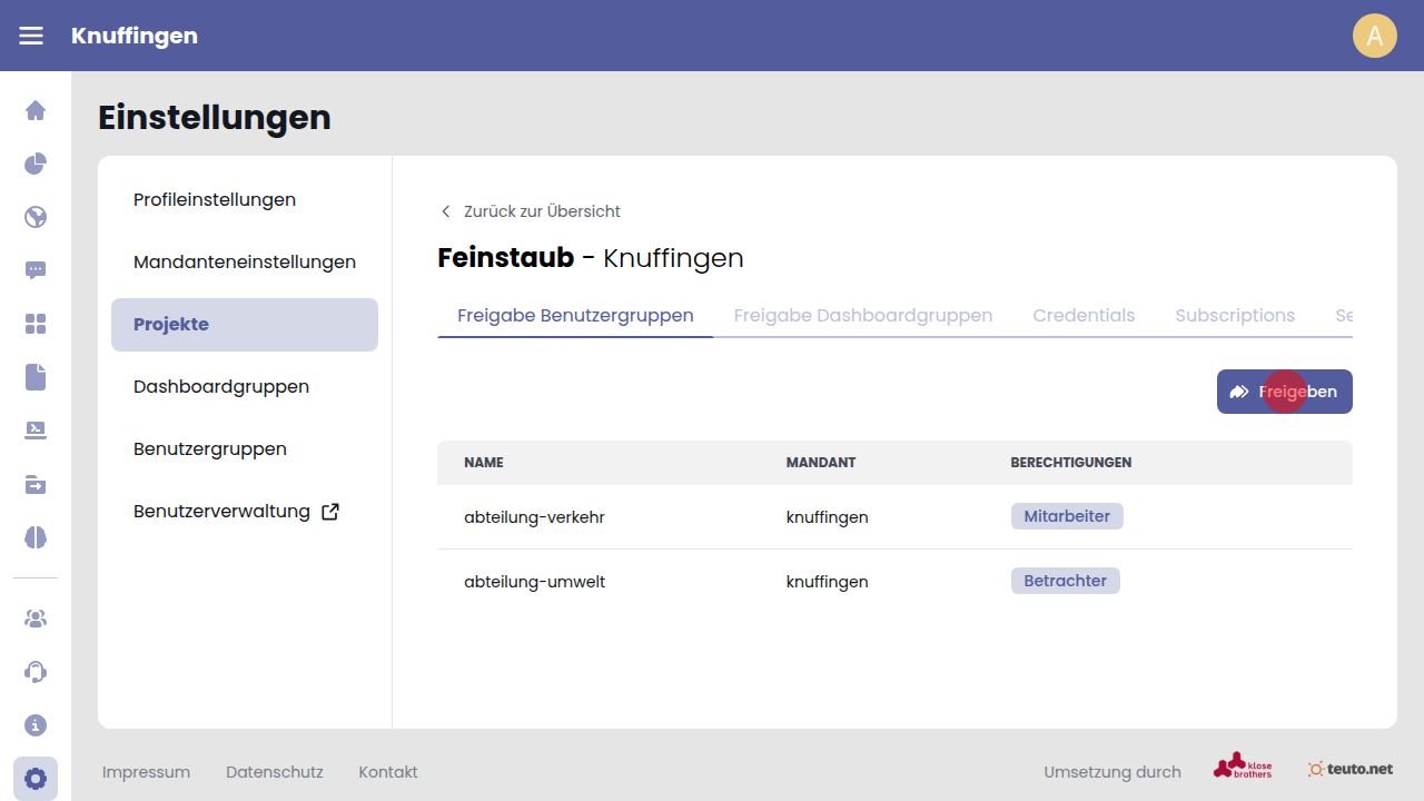 - "Mitarbeiter" bedeutet Schreibzugriff auf das Projekt. Die Projekt-Detailansicht kann durch das Anklicken des Projektes aufgerufen werden, wo die Freigaben dieses Projektes an Dashboardgruppen und Benutzergruppen eingesehen und verwaltet werden können. Außerdem können Subscriptions und Credentials verwaltet werden.