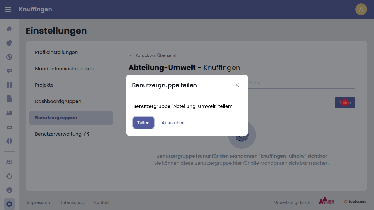 Beim Teilen einer Benutzergruppe wird diese für alle anderen Mandanten sichbar gemacht. Dies dient zur mandantenübergreifenden Zusammenarbeit, da so Projekte und Dashboardgruppen für diese Benutzergruppe freigegeben werden können, auch wenn diese anderen Mandanten gehören.