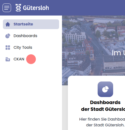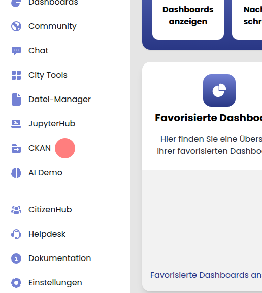 Gov Hub und Citizen Hub eines Mandanten bieten in der Navigation jeweils einen Direktlink zu der jeweiligen CKAN-Organisation, um einen einfachen Zugriff auf die Daten des eigenen Mandaten zu ermöglichen.