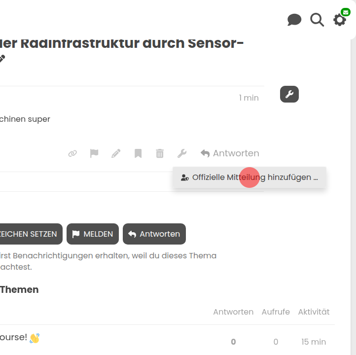 Um eine offizielle Mitteilung hinzuzufügen muss zuerst auf die 3 Punkte unter dem entsprechenden Beitrag geklickt werden, dann auf das Schraubenschlüsselsymbol und dann auf "Offizielle Mitteilung hinzufügen".