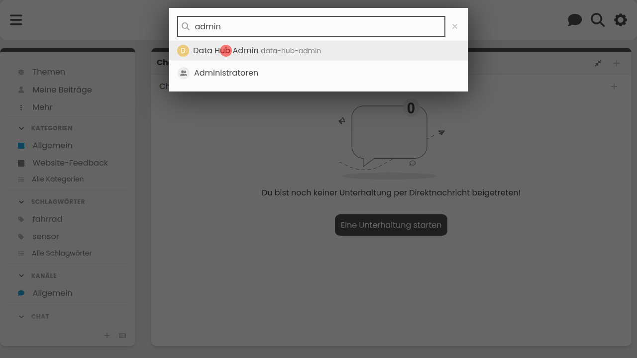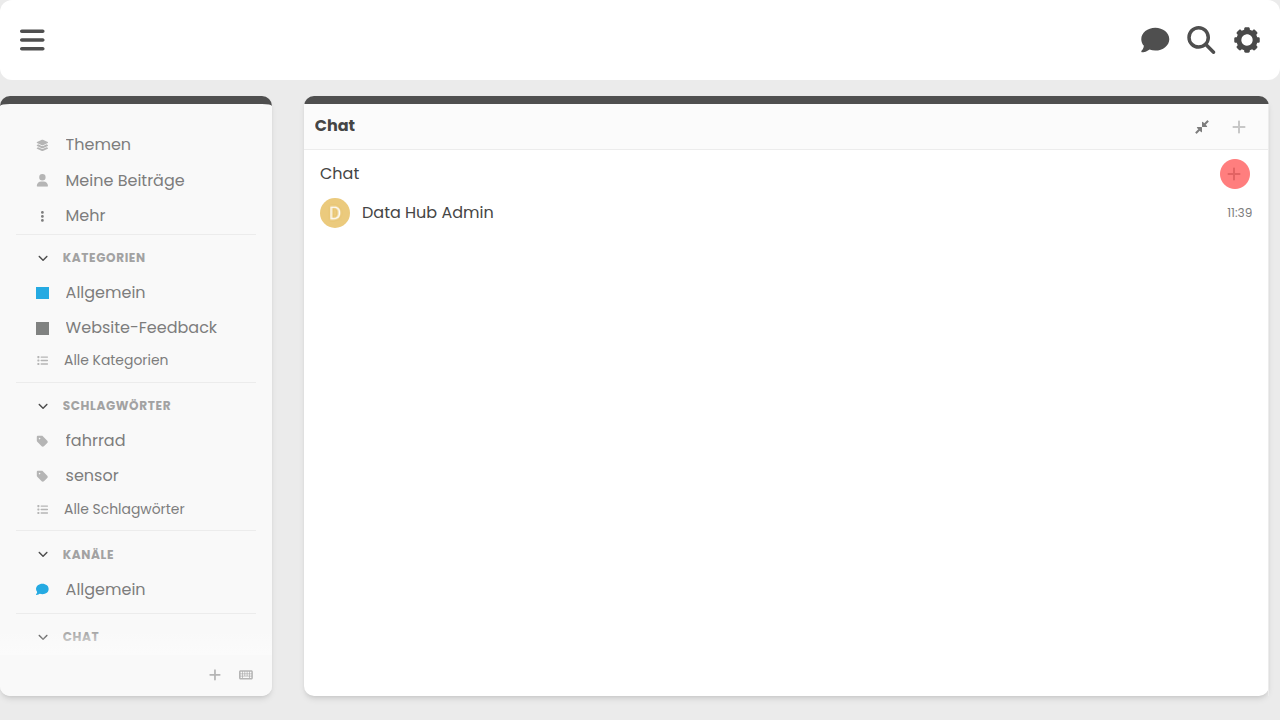 Um Direktnachrichten an andere Teilnehmende des Forums zu senden, kann der Menüpunkt "Chat" im Gov Hub genutzt werden. Dadurch wird der Chat im Vollbildmodus angezeigt.