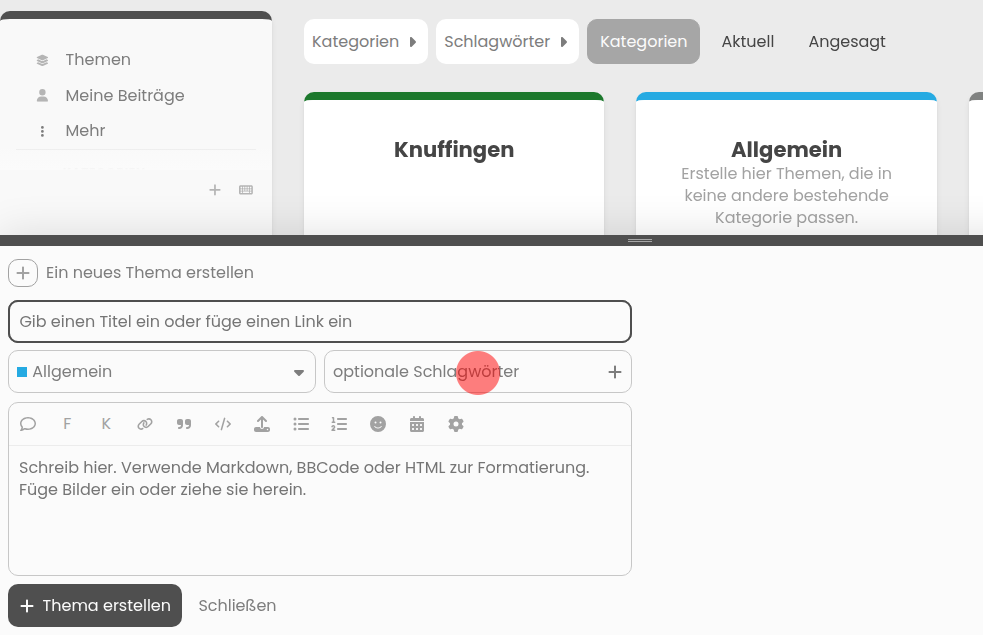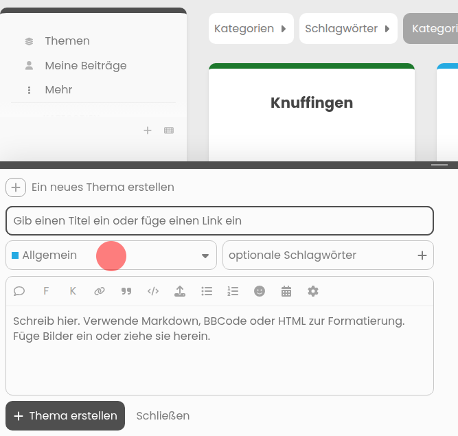 Befindet man sich bereits im Kontext einer Kategorie, wird das neue Thema in dieser Kategorie erstellt. Wird das Thema von der Hauptseite aus erstellt, muss über das Kategorie-Auswahl-Dropdown eine Kategorie ausgewählt werden.