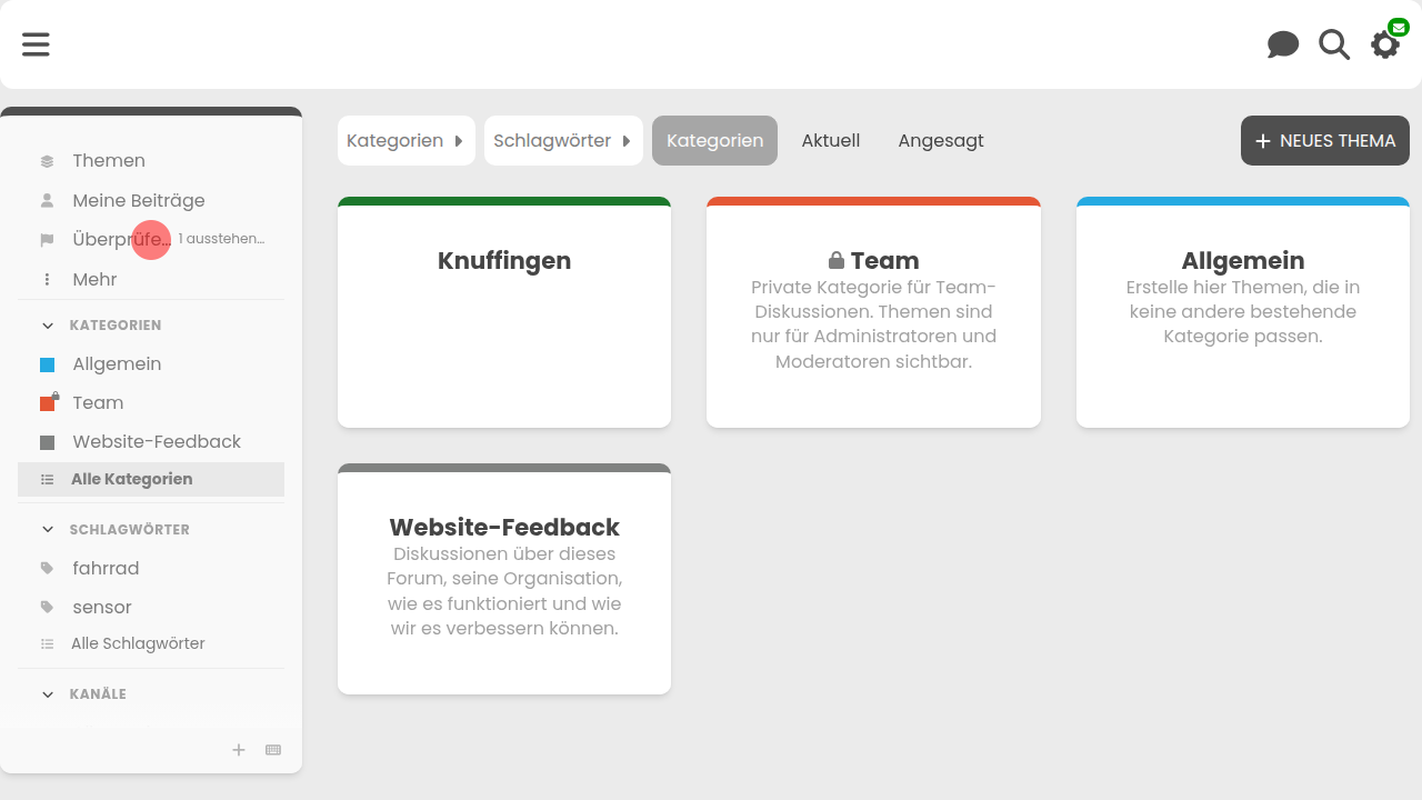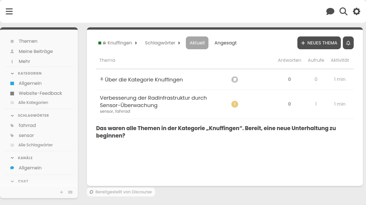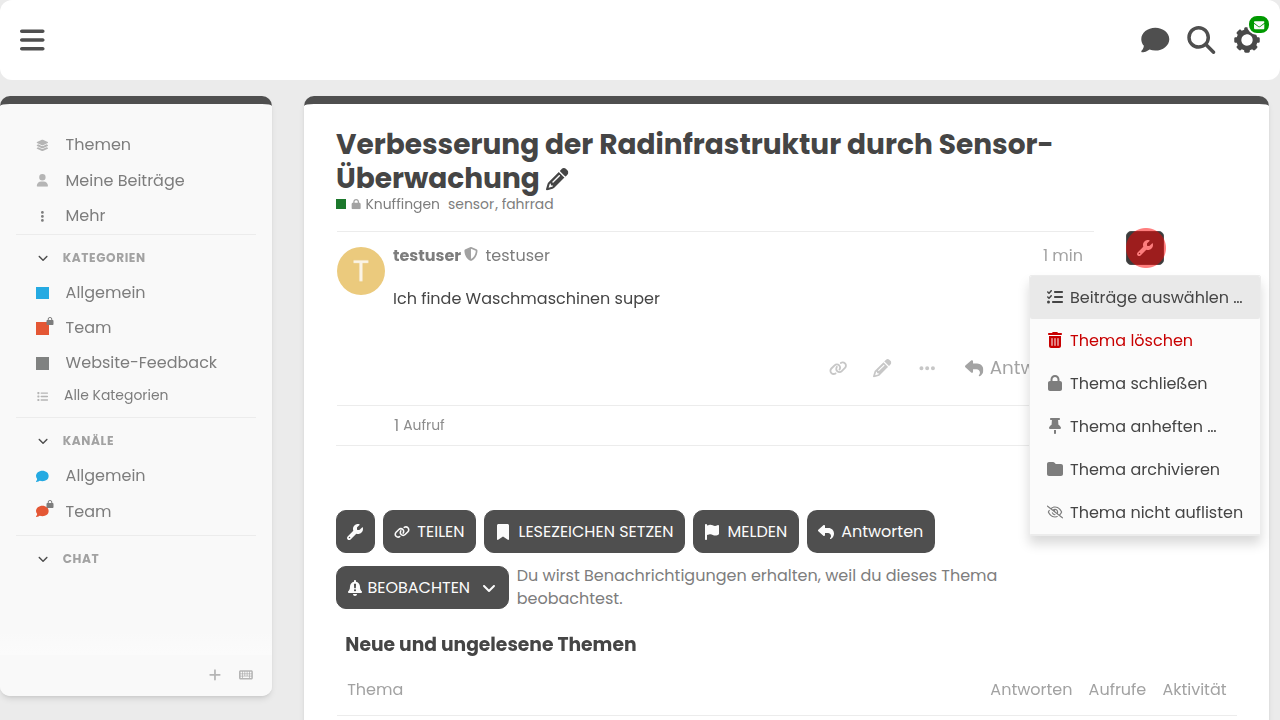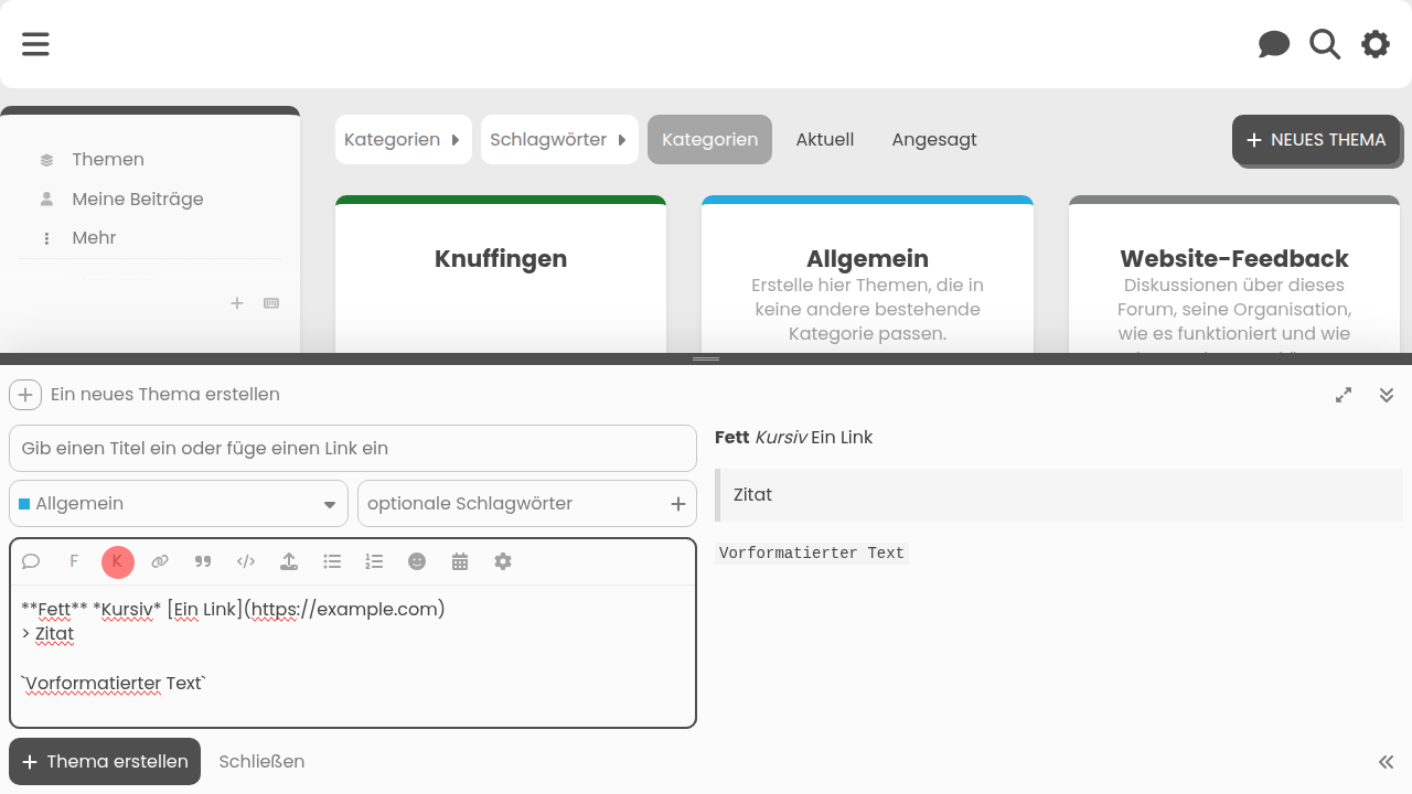 Ein Thema besteht aus einem Titel und mehreren Beiträgen. Sowohl Themen als auch Beiträge können von allen Nutzenden in Kategorien erstellt werden, die sie sehen können.