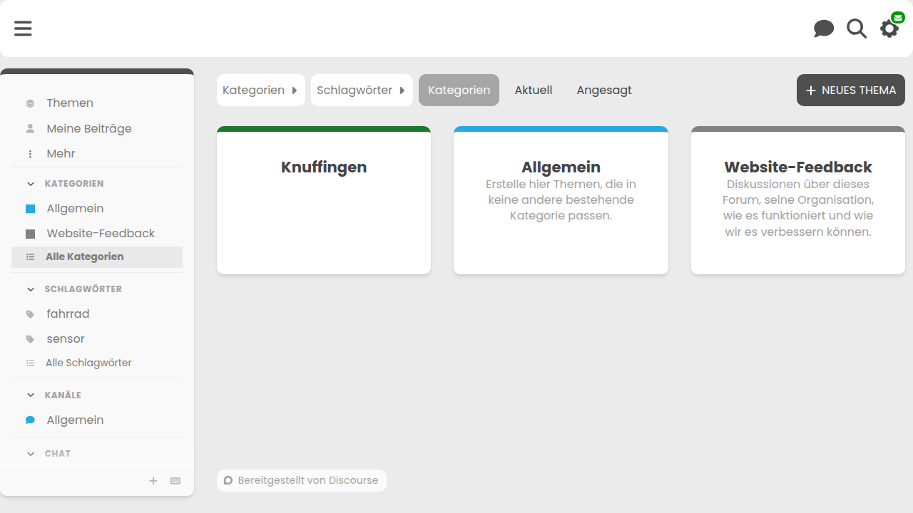 Kategorien sind die oberste Ebene in Discourse, alle Themen sind genau einer Kategorie zugeordnet. Kategorien können nur von globalen Discourse-Administratoren erstellt und gelöscht werden.