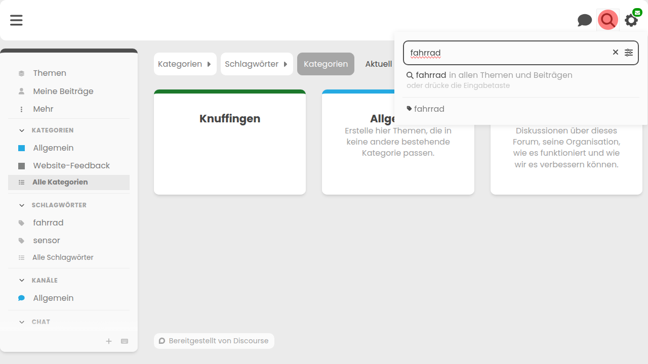 Um im Community-Forum zu suchen, kann die Suchfunktion durch das Drücken des Lupen-Icons oben rechts verwendet werden.