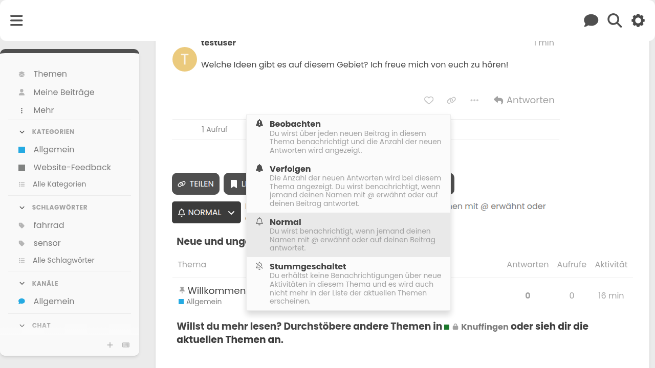 Die Benachrichtigungen für ein Thema können individuell über den Button mit dem Glockensymbol konfiguriert werden, wobei immer die aktuelle Einstellung angezeigt wird: