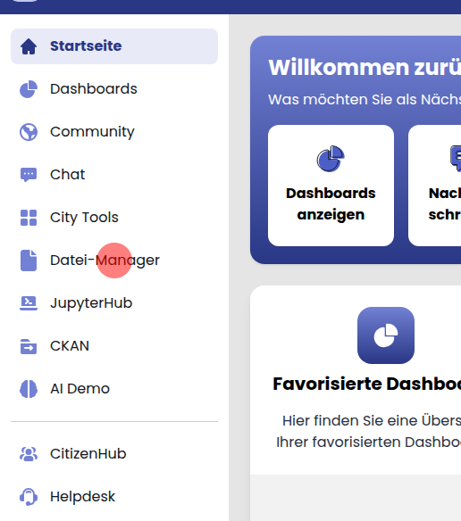 Der Datei-Manager ist fest in den Gov Hub integriert und kann über das Hauptmenü aufgerufen werden.