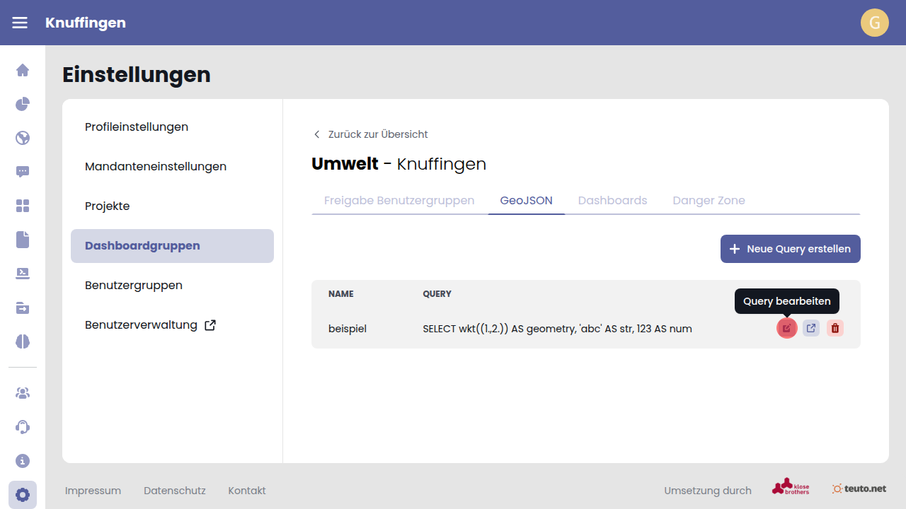 Abfragen können in der Detailansicht für Dashboardgruppen im Reiter "GeoJson" verwaltet werden, dies ist nur Personen mit der Berechtigung "Mitarbeiter" auf der Dashboardgruppe möglich.