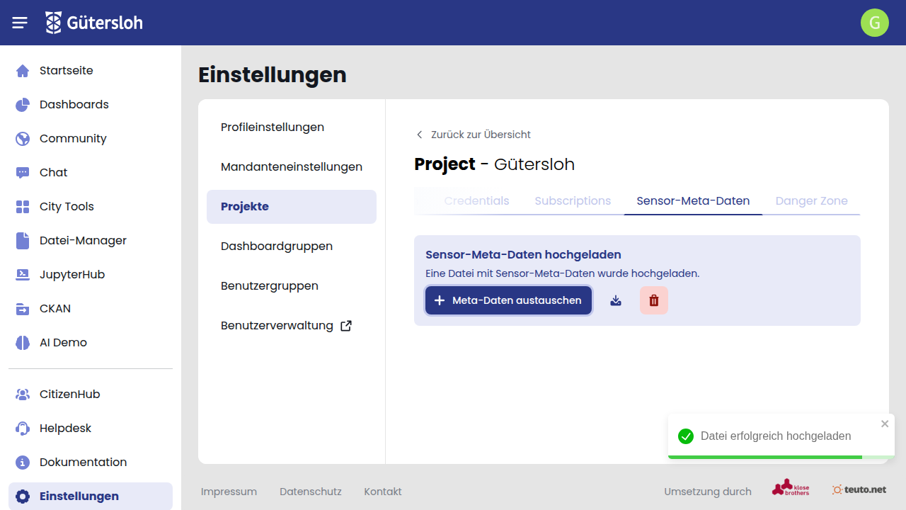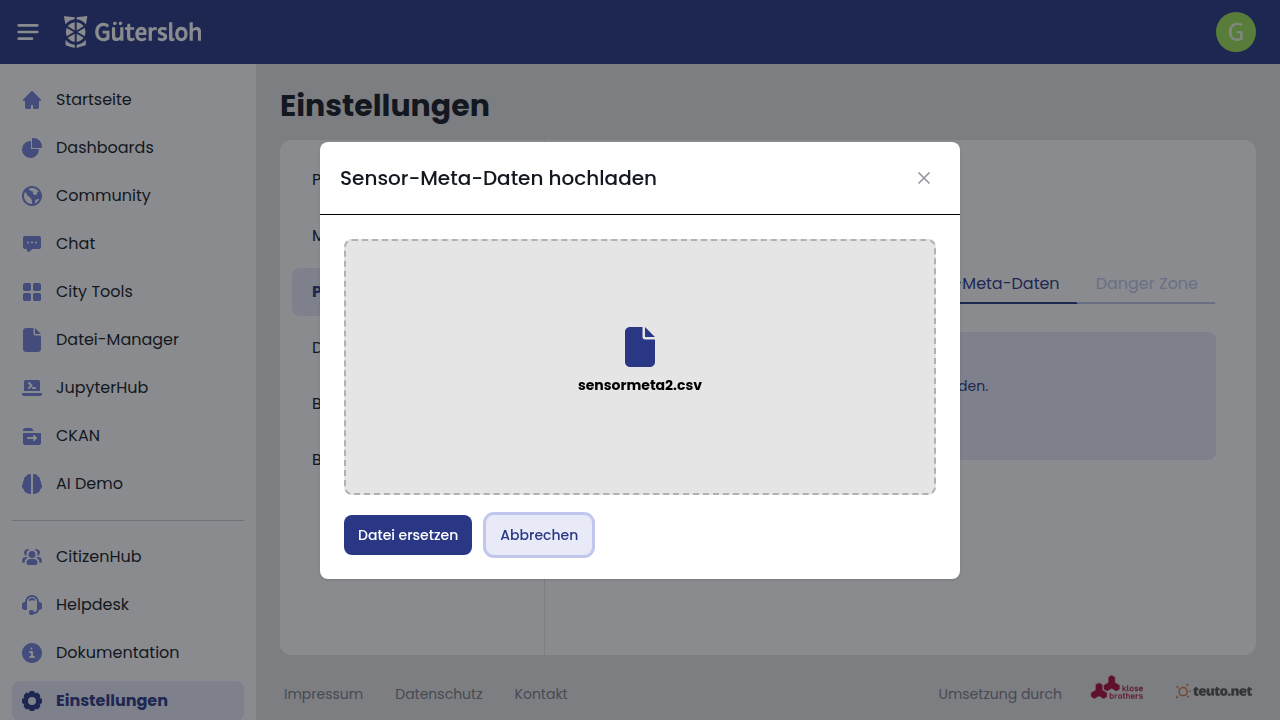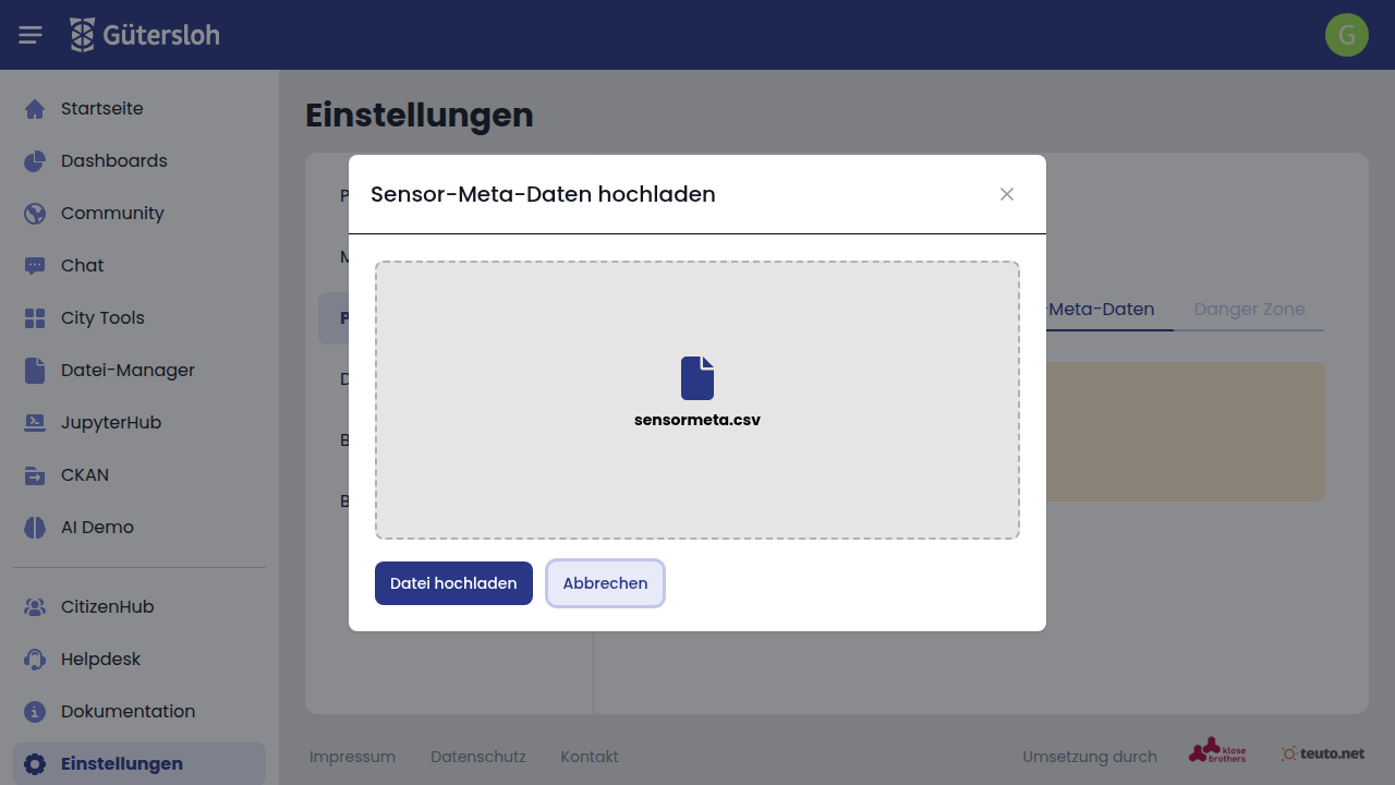 Auf dieser Seite können Sensor-Meta-Daten als CSV-Dateien hochgeladen und verwaltet werden.